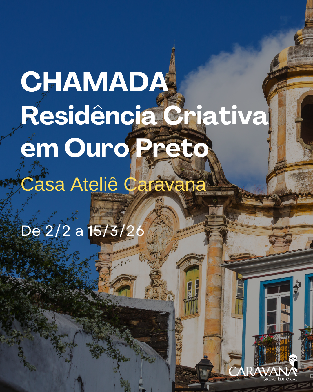Esta é uma iniciativa da Caravana Grupo Editorial para o programa de Residência Criativa, em Ouro Preto, no nosso ateliê, aberta aos autores da casa, a autores independentes e de outras editoras, no ano de 2026.